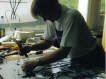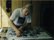Pieces of glass will be cut according to a design template. After the cutting the glass pieces will get a further procession, if wanted, such as sand blasting, gluing, painting or fusing. Then they will be put together with lead rods to be soldered. |