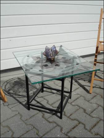Bei diesen Scheiben ist eine Technik, ähnlich der Intarsienarbeiten, zur Anwendung gekommen. Es werden hier die einzelnen Glasstücken passgenau aneinander geschliffen und dann mit einem speziellen Silikon auf eine Trägerscheibe aufgebracht. |